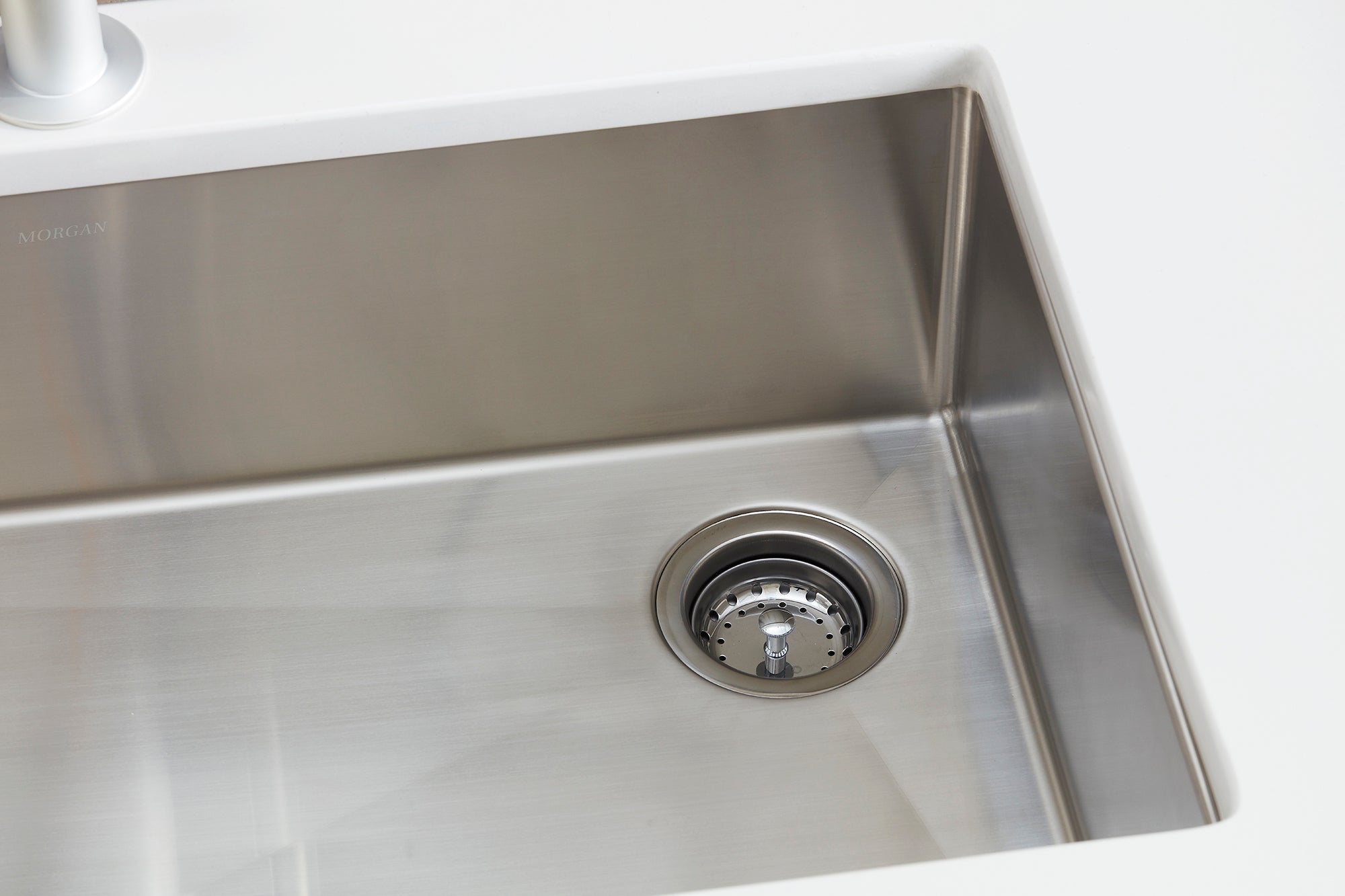 Corner drains optimize usable bottom cabinet space.